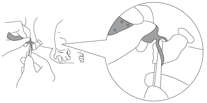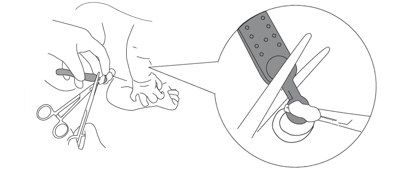 Once correctly positioned, the handle is cut off, leaving a discreet and flexible ring securely placed around the umbilical stump.