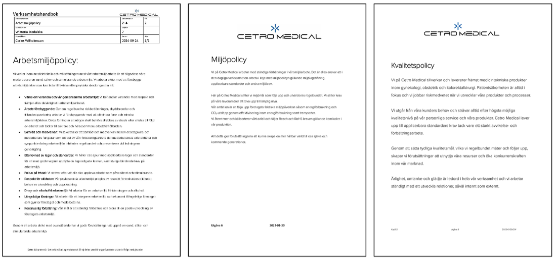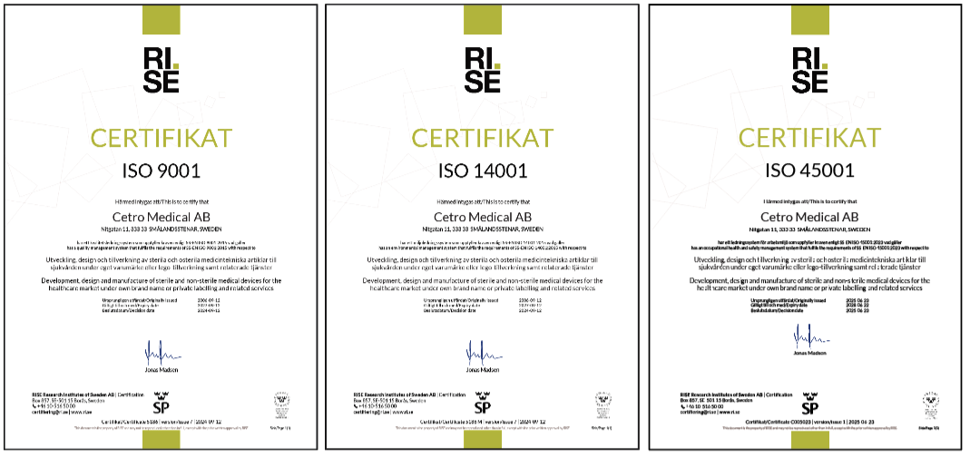 Cetro Medical är certifierade enligt MDR – EU 2017/745, ISO 13485, ISO 9001, ISO 14001 och ISO 45001. Detta ger dig som kund en trygghet i att vi uppfyller marknadens högt ställda krav inom patientsäkerhet, kvalitet, miljö och arbetsmiljö.